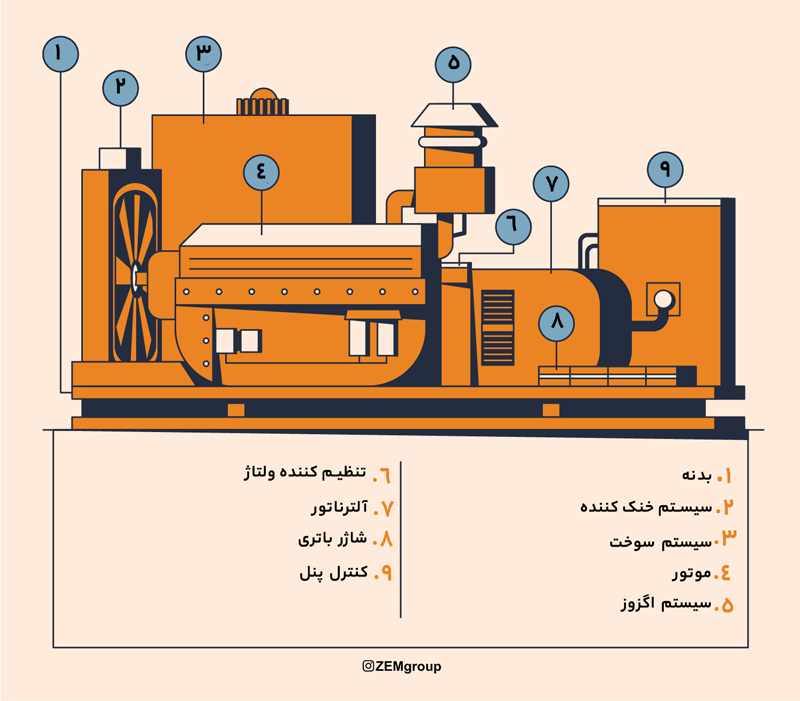 همان مولد برق که حرکت مکانیکی موتور را به جریان الکتریکی تبدیل میکند. از دو بخش اصلی تشکیل شده: روتور (قسمت متحرک که میدان مغناطیسی ایجاد میکند) و استاتور (قسمت ثابت که در آن برق القا میشود). معمولاً همراه با یک رگولاتور ولتاژ (AVR) کار میکند تا ولتاژ خروجی ثابت بماند. - سیستم سوخت