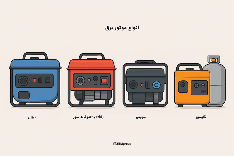 حال میخواهیم درباره انواع موتور برقها صحبت کنیم و آنها را بر اساس نوع سوخت مصرفی، نوع برق خروجی، تکنولوژی تولید برق، جابجایی و توان خروجی دستهبندی کنیم: