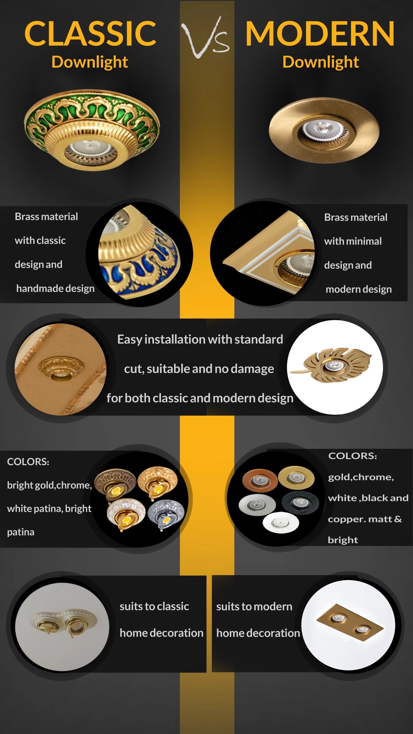 Next, we will thoroughly examine the design differences, applications, and visual impact of classic downlights and modern downlights, and explore how brass material can elevate both styles to a higher level of beauty and durability.