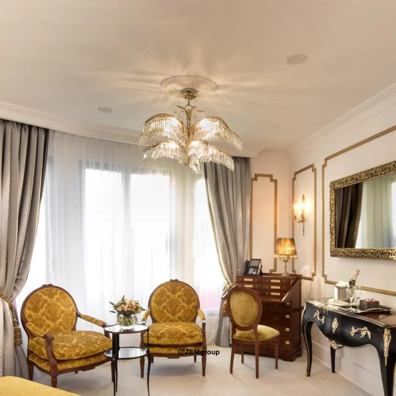 In more classic designs, brass ceiling lights with intricate gold details are popular, offering durability and a luxurious appearance alongside warm-colored décor and wooden furniture—perfect for executive suites or royal-style rooms.
