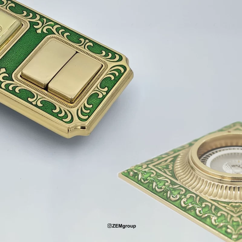 Switches and sockets: gold body with Emerald green details for a royal and aristocratic look.