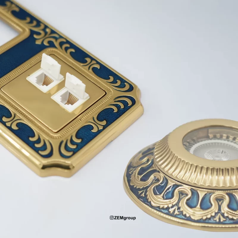 Switches and sockets: royal and calming gold and blue combination, suitable for bright and serene spaces.