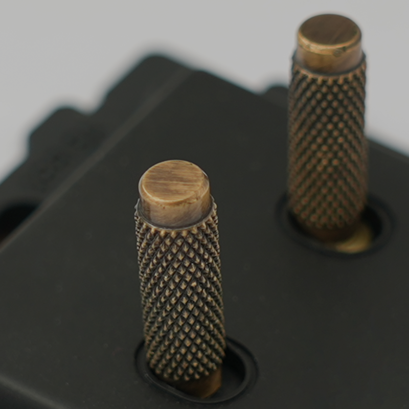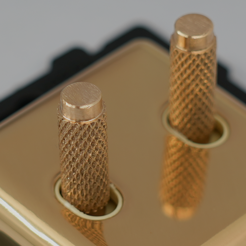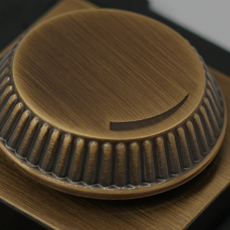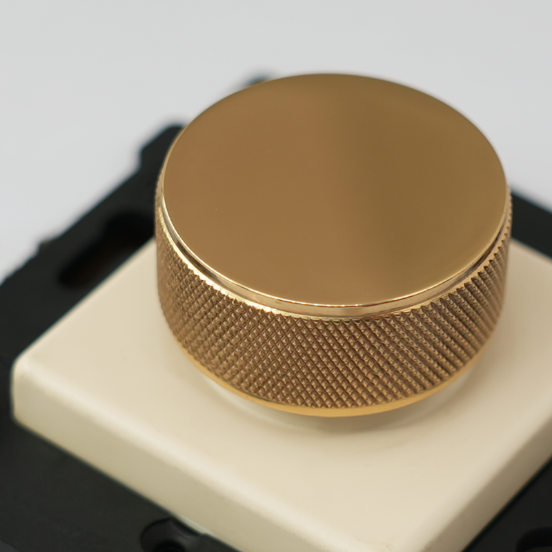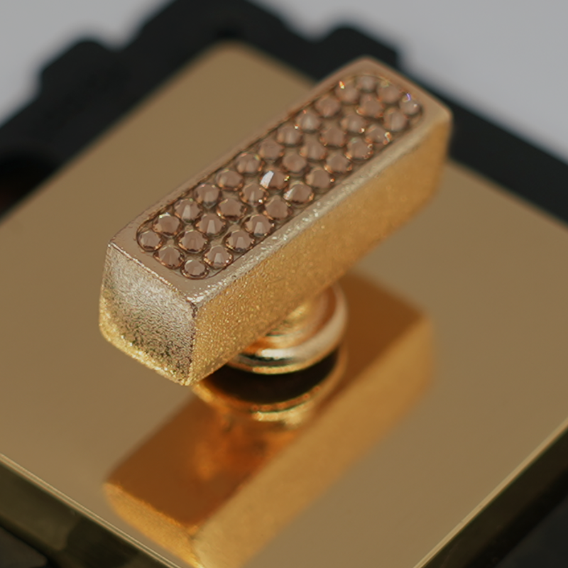 The rotary switch consists of a rotary knob and a cover plate connected to the mechanism. The rotary knob is made of brass and is available in silver, bright gold, bright patina, bright chrome, copper, and limited edition models with Swarovski crystals.