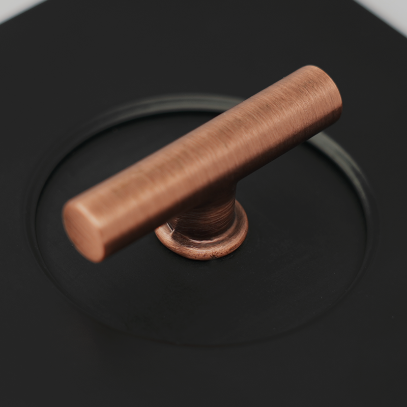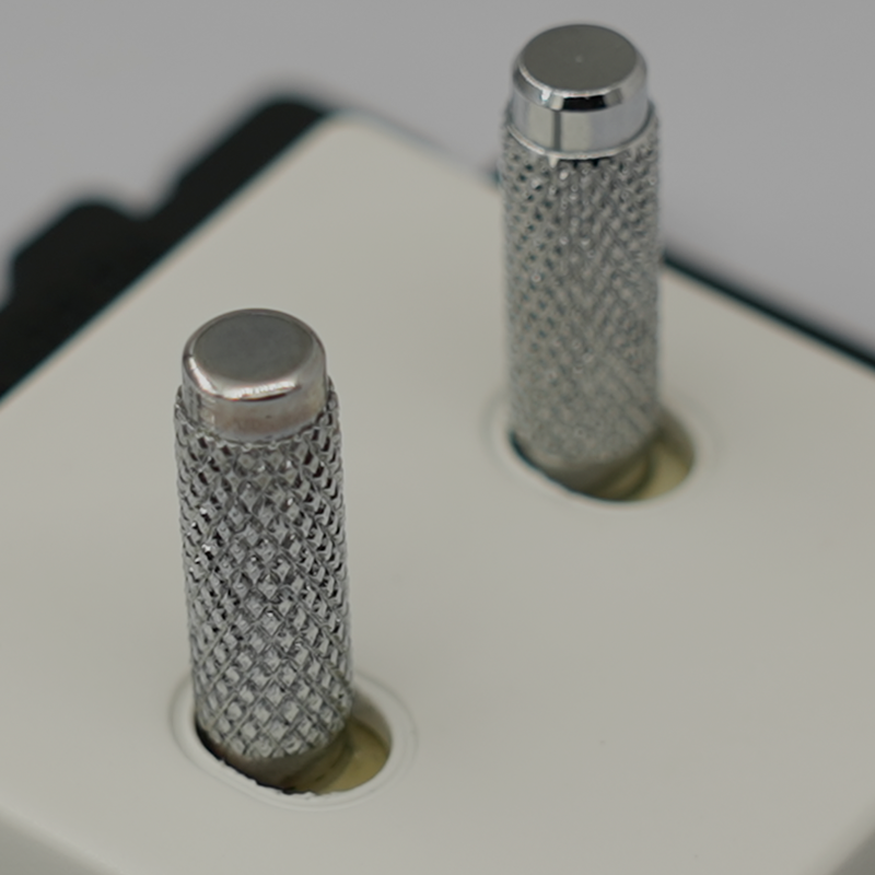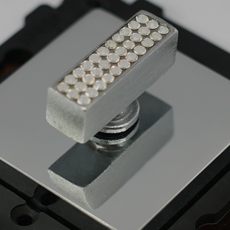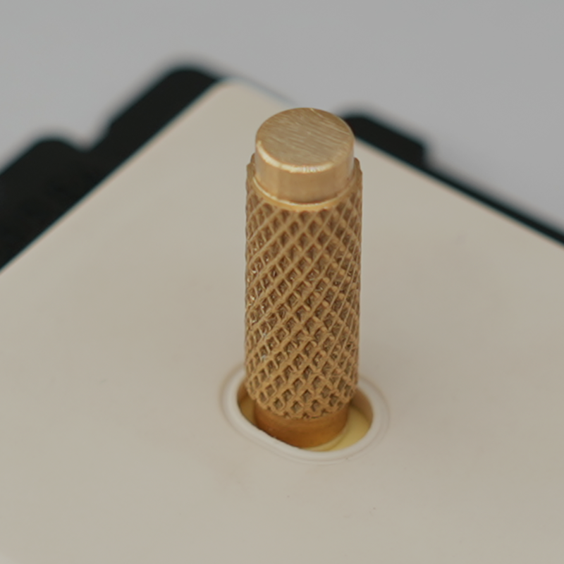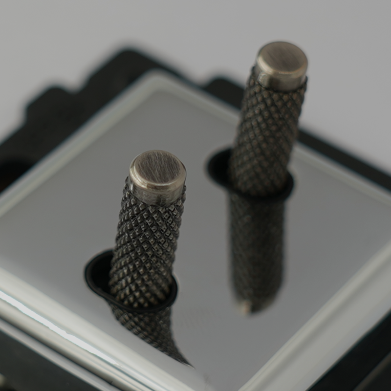 The rotary switch consists of a rotary knob and a cover plate connected to the mechanism. The rotary knob is made of brass and is available in silver, bright gold, bright patina, bright chrome, copper, and limited edition models with Swarovski crystals.