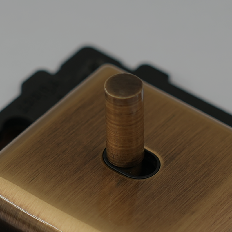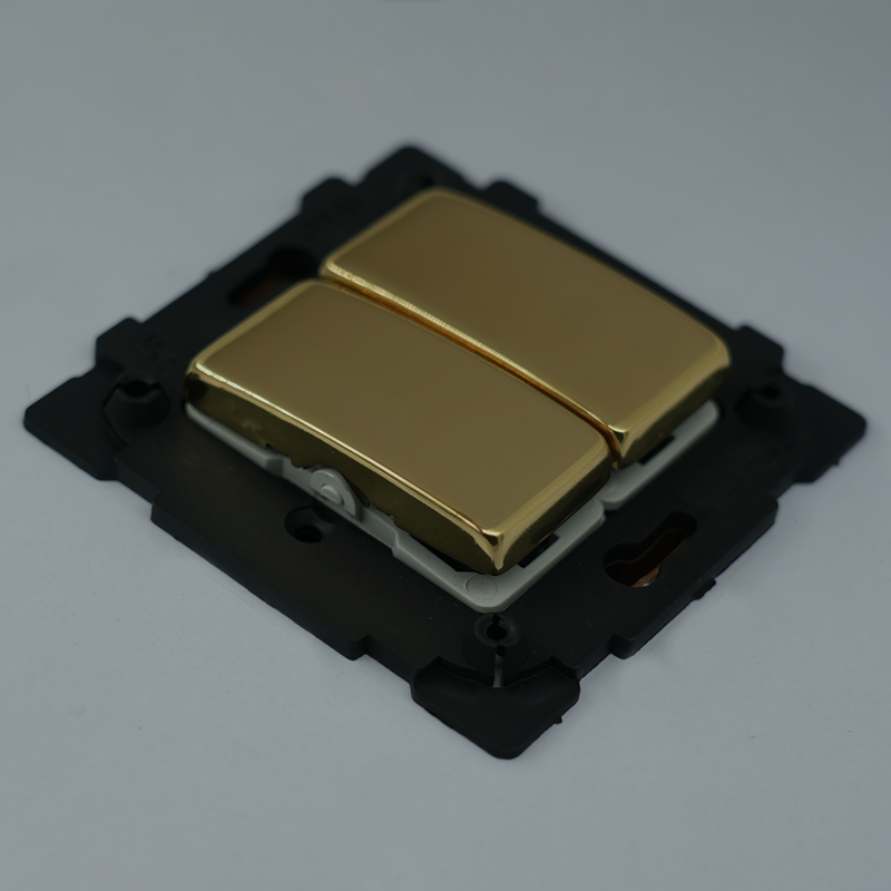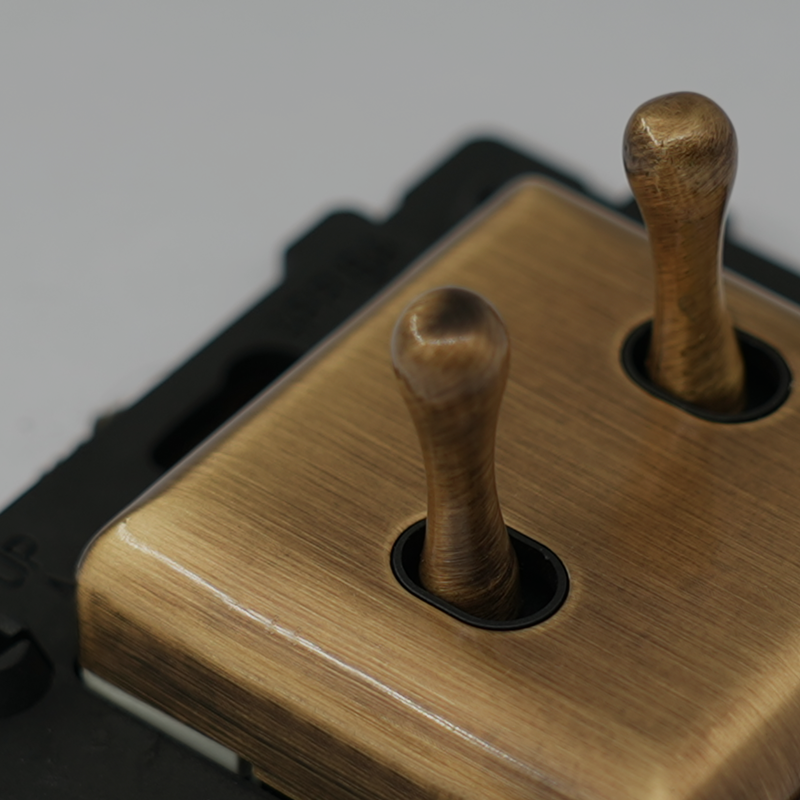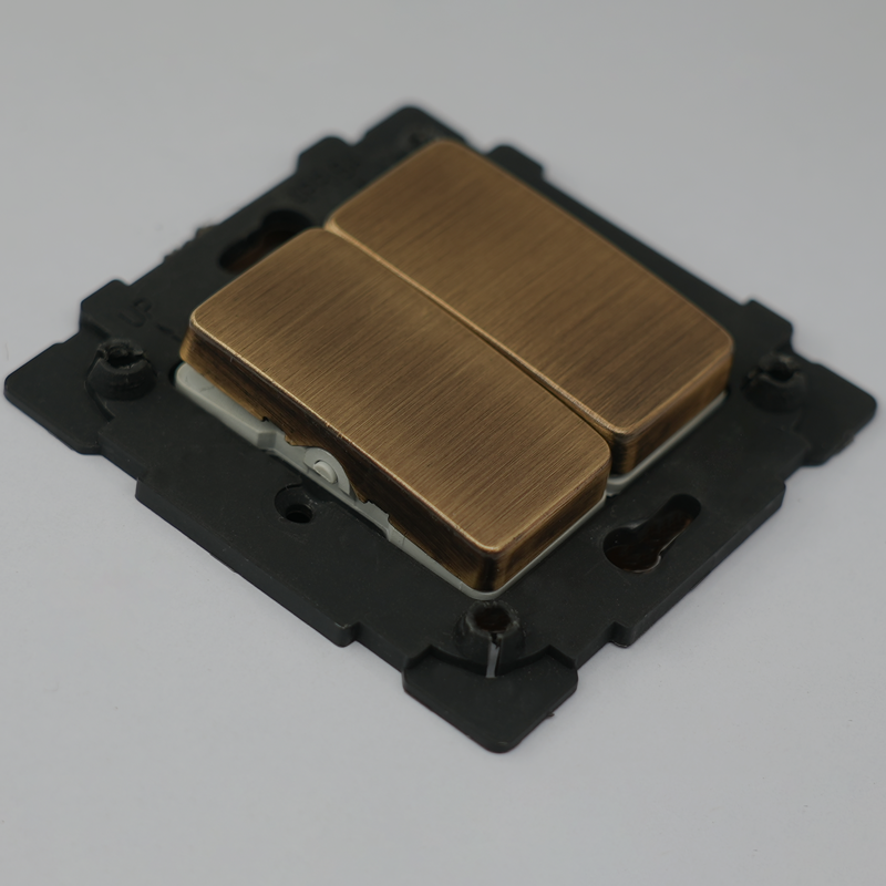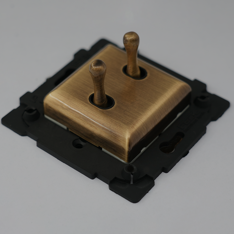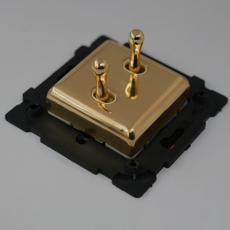 The cover plate of the double one-way toggle switch can be made of plastic (white or black) or brass (bright gold, bright patina, bright chrome, etc.). Customization options are available for this type of double one-way toggle switch.