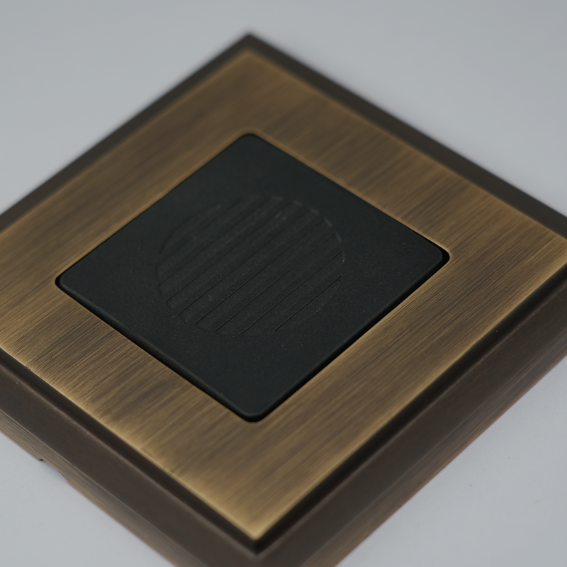 The covers for double one-way switches are also available in two material types: ABS plastic (white and black) and brass (bright gold , bright patina, copper, white patina, and bright chrome). ZEM also offers customization options for the final finish of these types of switches.