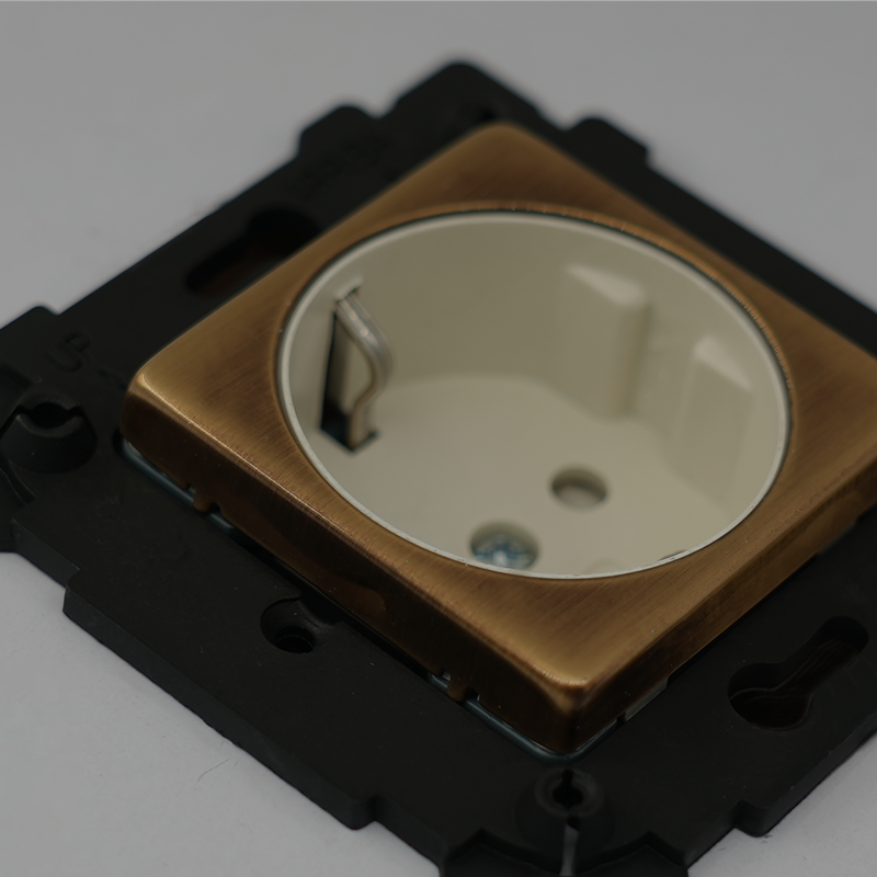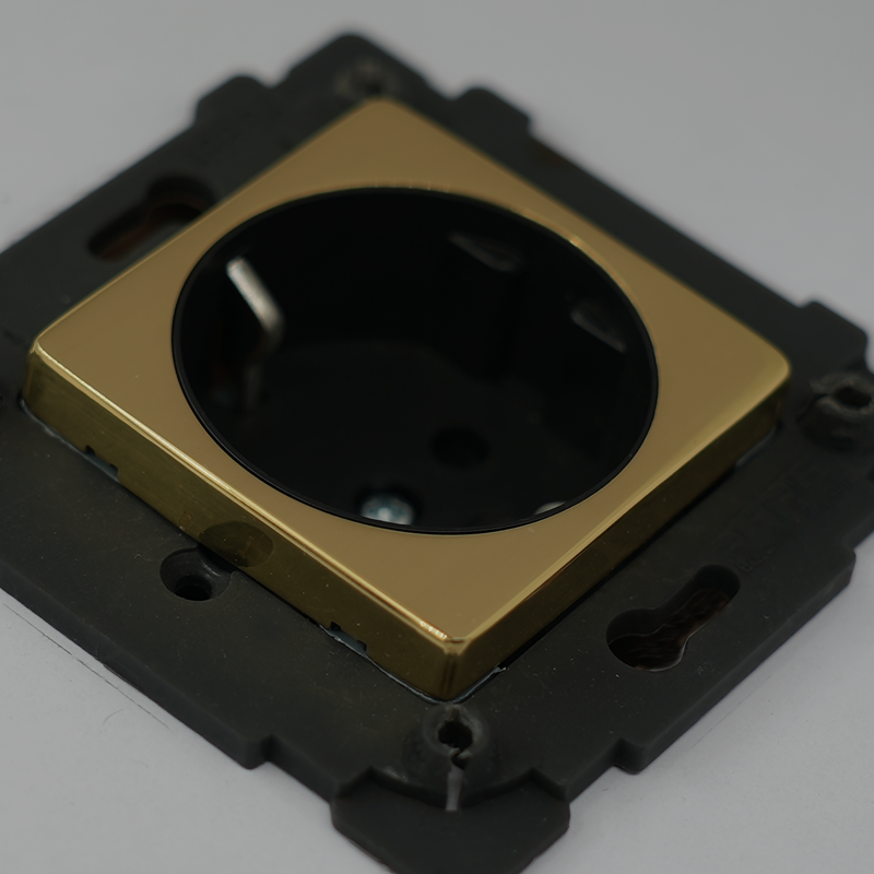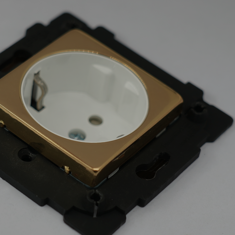 Each SCHUKO socket consists of a mechanism and a cover plate. The cover plates are available in plastic (white and black) or brass (bright gold, bronze, bright chrome, bright patina, etc.).
