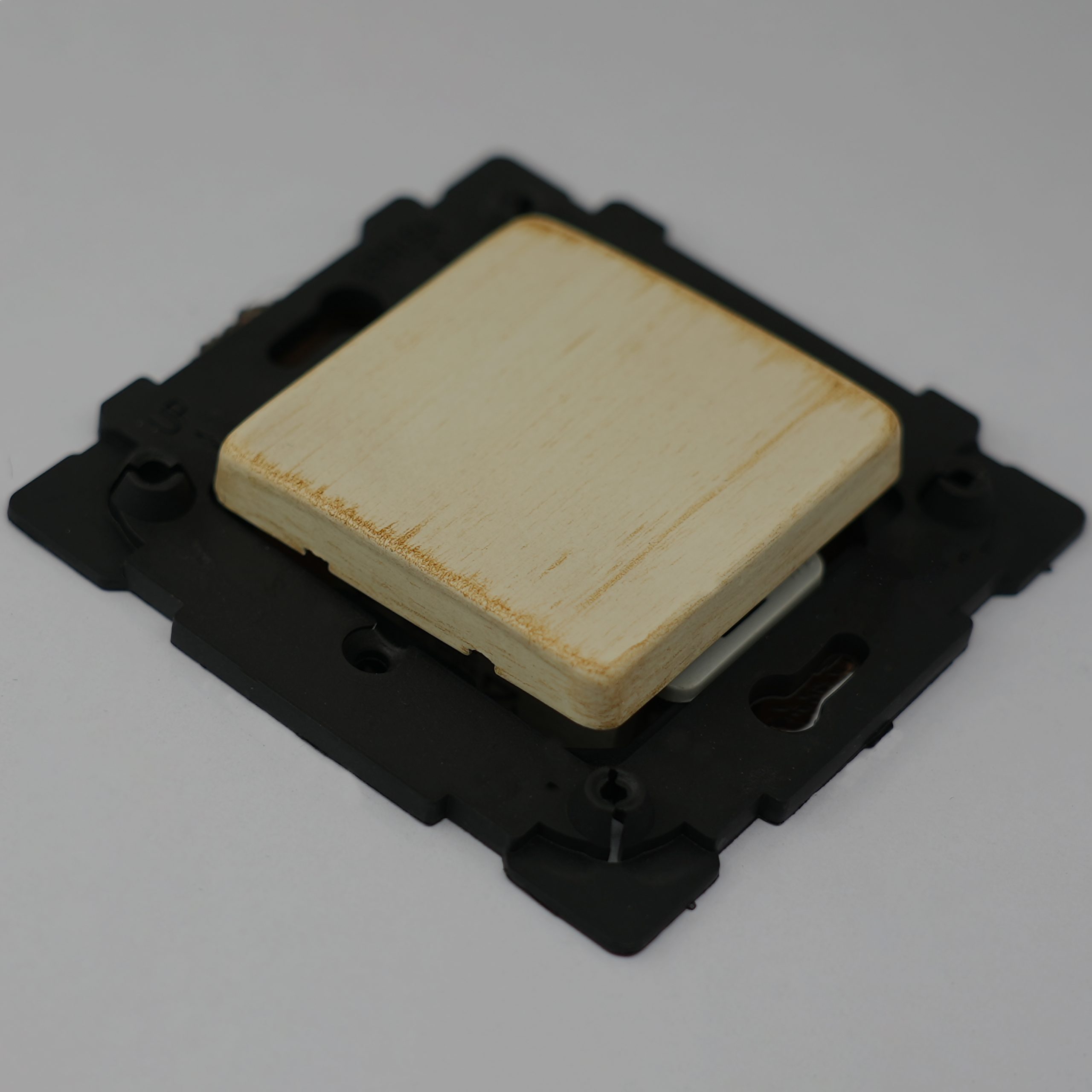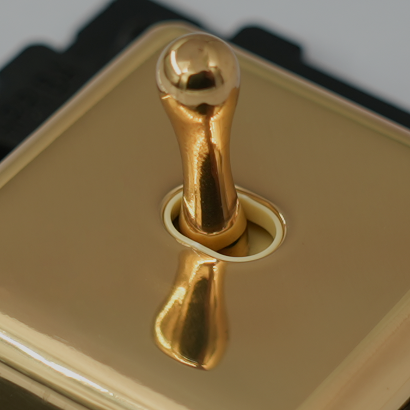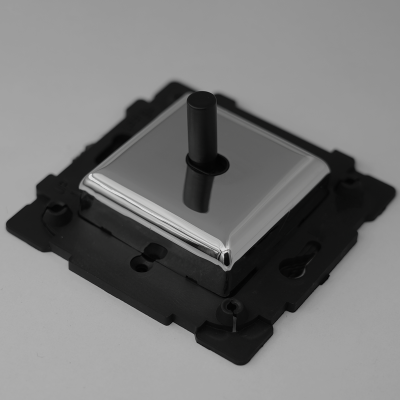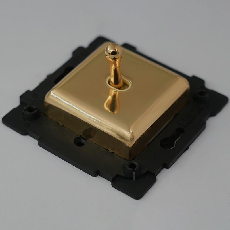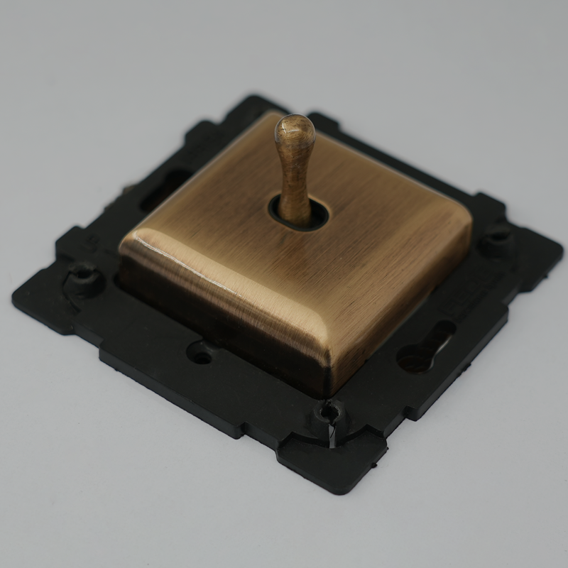 The cover plate of the one-way toggle switch can be made of plastic (white or black) or brass (bright gold, bright patina, bright chrome, etc.). Customization options are available for this type of one-way toggle switch.