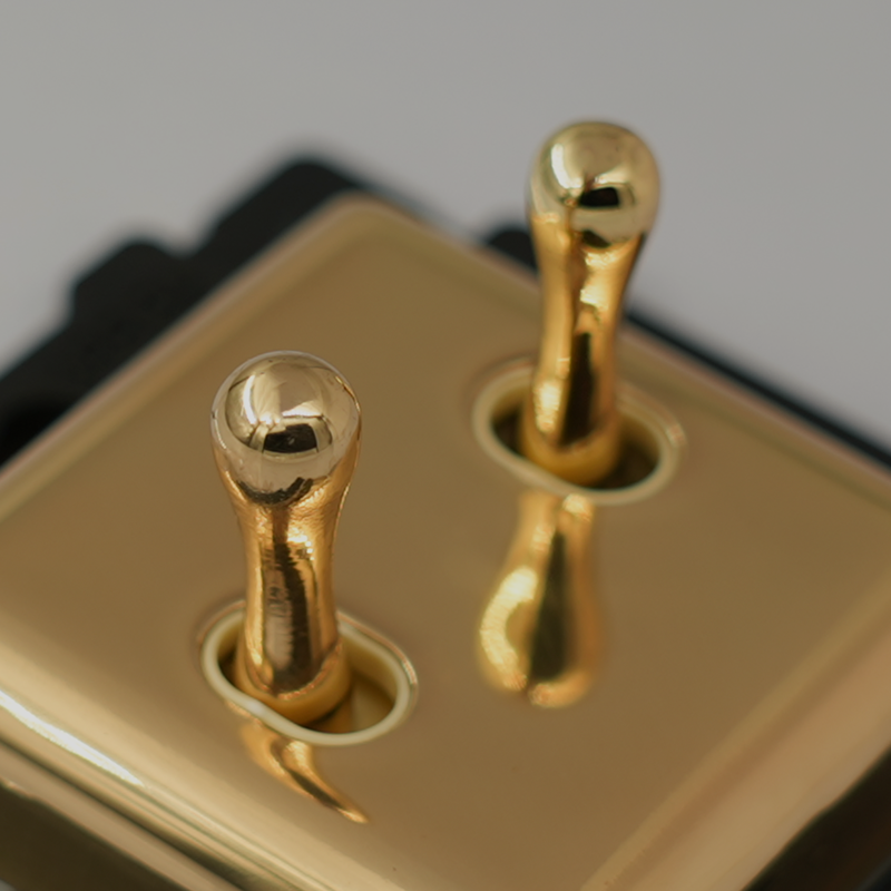 Double one-way toggle switches include two toggles and one cover plate. The toggles are made of brass and come in white, black, bright gold, bright patina, and bright chrome colors, available in both modern and classic styles.