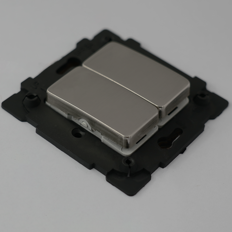 The double push-button switch includes two independent spring-loaded push-buttons within a single double-switch frame. Each button only connects the circuit while being pressed and returns immediately to the off position when released. This mechanism is used for controlling doorbells, relays, timers, or in smart home systems for sending momentary commands.