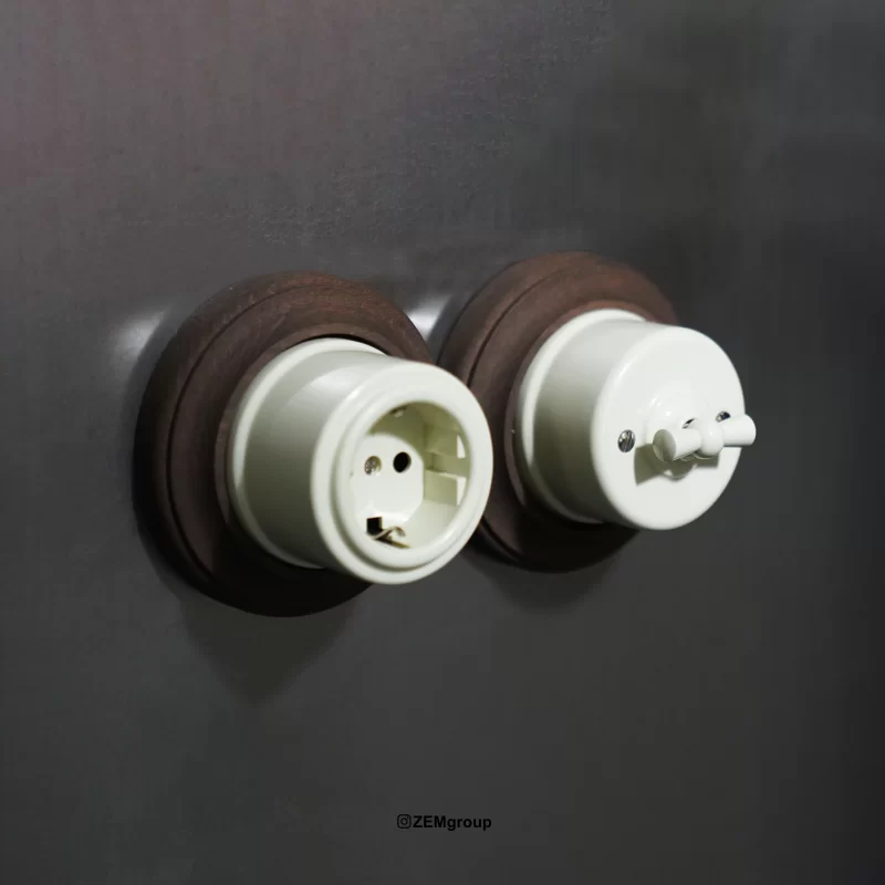 دسته دوم، کلید و پریز روکار سرامیکی و پلاستیکی است که ترکیبی از قاب چوبی و اجزای سرامیکی یا پلاستیکی دارد. در این مدل‌ها تلاش شده تعادل مناسبی میان زیبایی، وزن کمتر و قیمت اقتصادی‌تر ایجاد شود. بخش‌های پلاستیکی معمولاً از متریال مقاوم در برابر حرارت و ضربه ساخته می‌شوند و در کنار جزئیات برنجی، ظاهری مدرن‌تر و کاربردی‌تر به محصول می‌دهند. این مدل‌ها انتخاب مناسبی برای فضاهای نیمه‌دکوراتیو، محیط‌های اداری یا پروژه‌هایی هستند که هم ظاهر و هم صرفه اقتصادی اهمیت دارد.