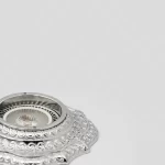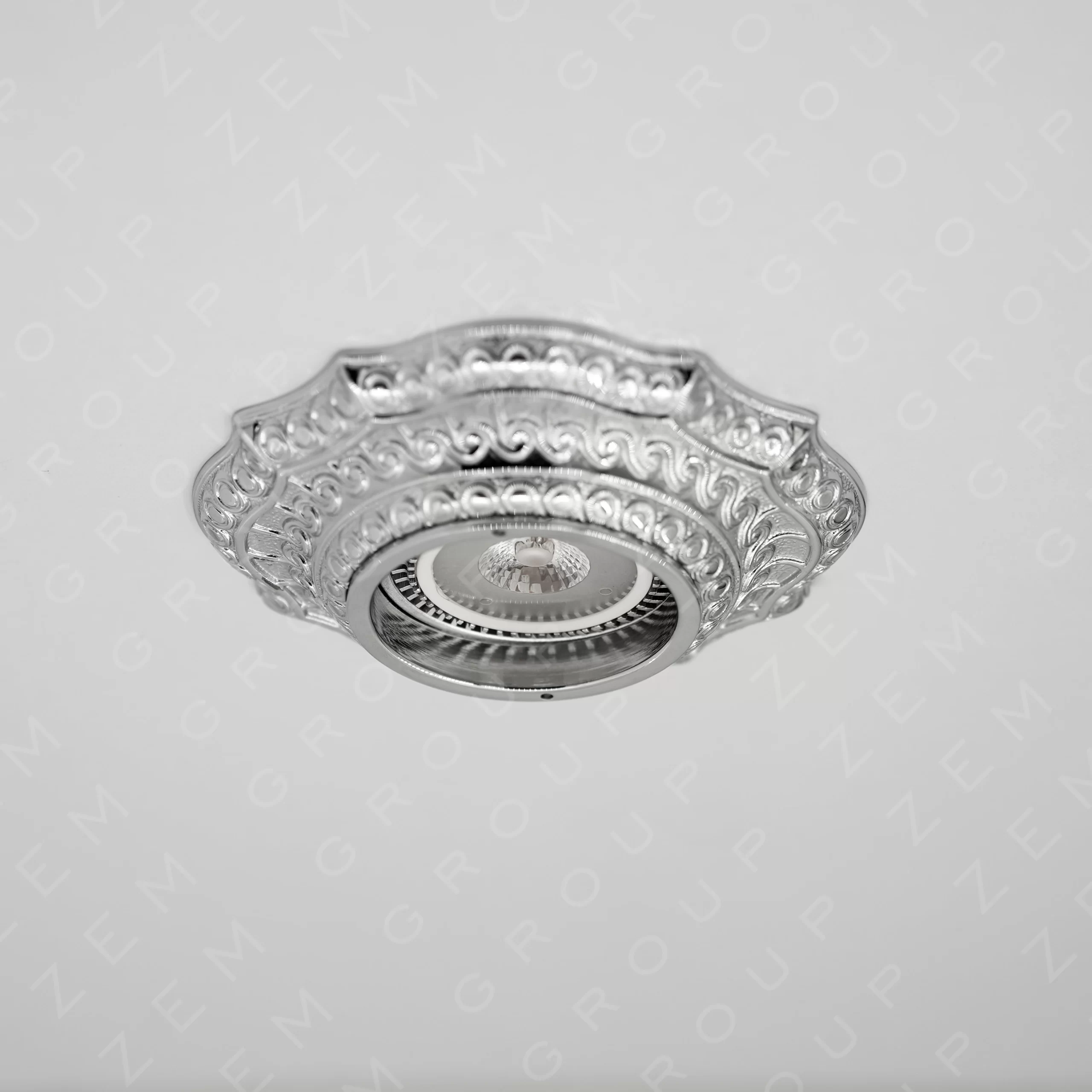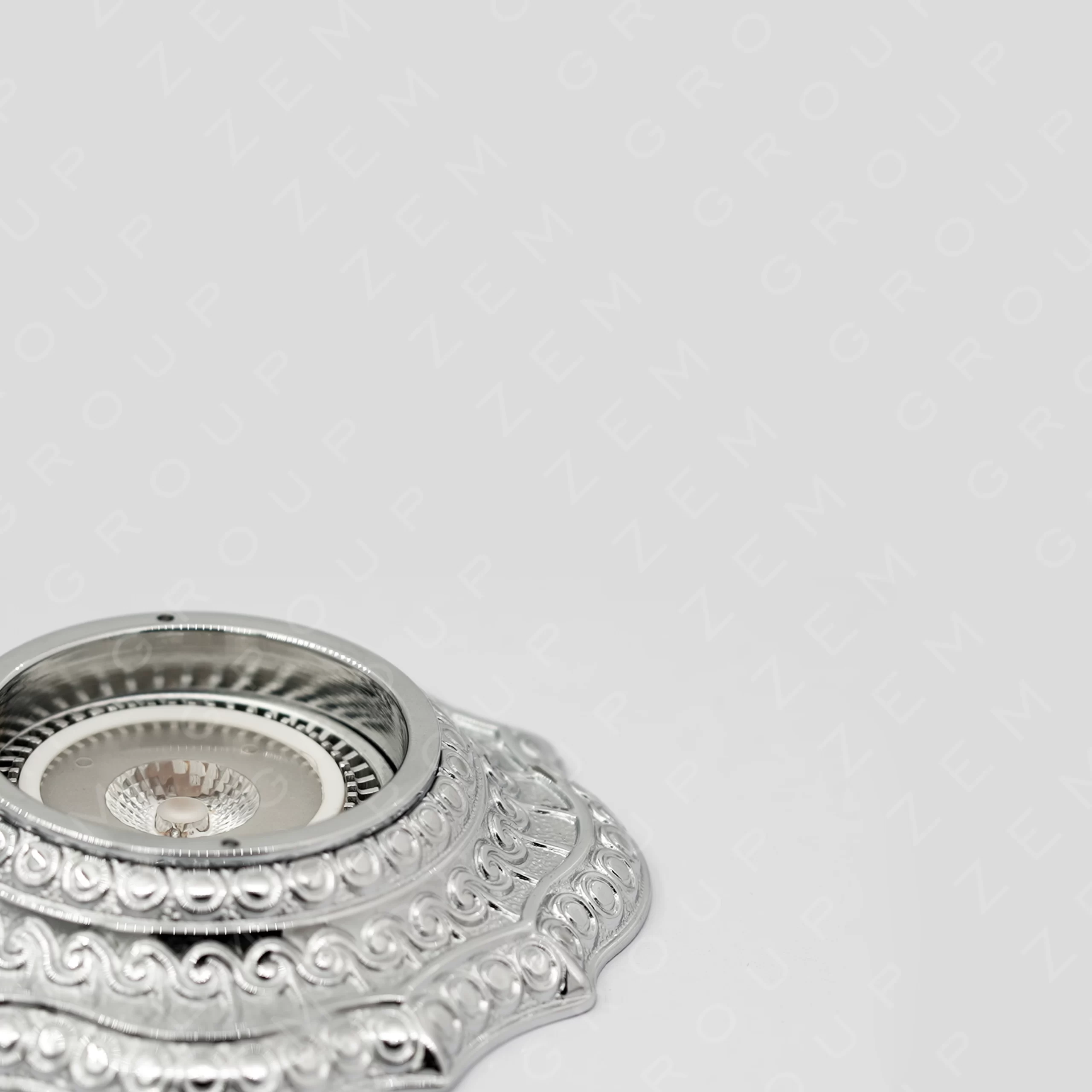 نقش و نگار های فریم هالوژن سقفی همگی کار دست هنرمندان است.این چراغ سقفی توکار در رنگ های طلایی،نقره ای ،برنز و پتینه سفید و طلایی موجود است.
